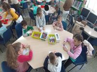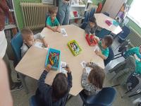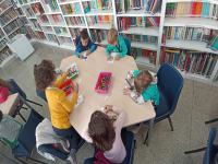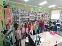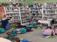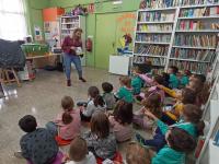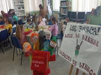 Gema, la bibliotecaria, nos recibe con mucha ilusión, nos cuenta dos cuentos "El gallo Kiriko", y "Se busca", con una ruleta de personajes y un cuento gigante la atención de lo niños/as está garantizada. Después hacemos un marcapáginas y por último podemos ver, ojear, tocar y leer cuentos infantiles, cuentos de animales, de marionetas, de tela, de miedo con casas encantadas, con sonidos, en 3D,...